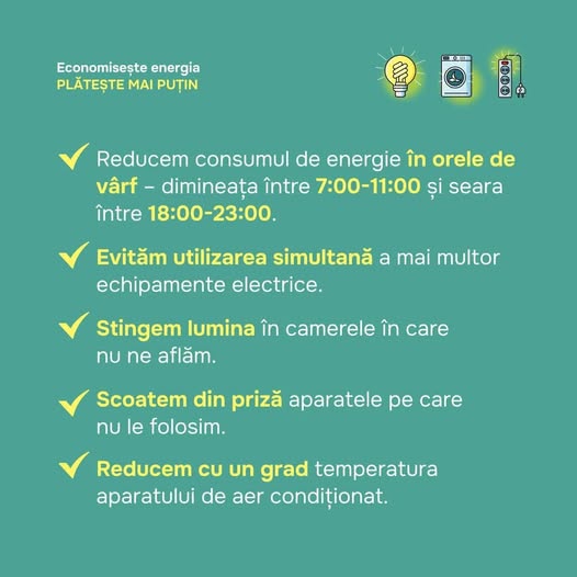 Se aduce la cunoştinţă prevederile dispoziţiei nr. 1 din 27 decembrie 2024 a Comisiei pentru situaţii Excepţionale a Republicii Moldova privind necesitatea şi importanţa consumului raţional de resurse energetice. Se stipulează: „Economisiţi energia electrică în orele de vârf: între 7.00 şi 11.00 şi 18.00 şi 23.00 pentru a plăti mai puţin şi a evita riscul unor deconectări”.